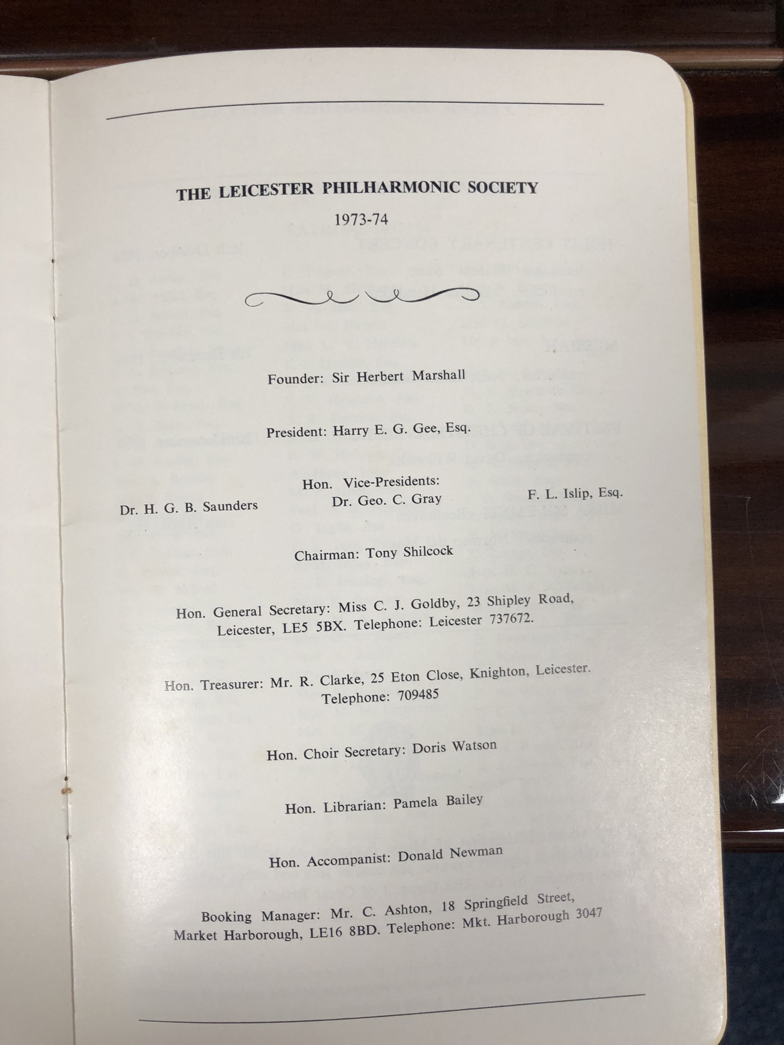 Leicester Music Society’s President is certainly the most knowledgeable person of the Classical Music field that I or many of the members of our society have ever known. His vast knowledge comes from his personal and direct involvement in the musical life of Leicester in many guises: singer, conductor, librarian, music critic, author, programme note writer etc. and, just as importantly, a member of this society in various incarnations for just over half a century. He has given talks for many of the last fifty seasons (his first aged eighteen) and all have been presented with the same humour, wisdom and insight—always illustrated with perfectly chosen musical examples and often with physical mementos and ephemera on display as evidence.