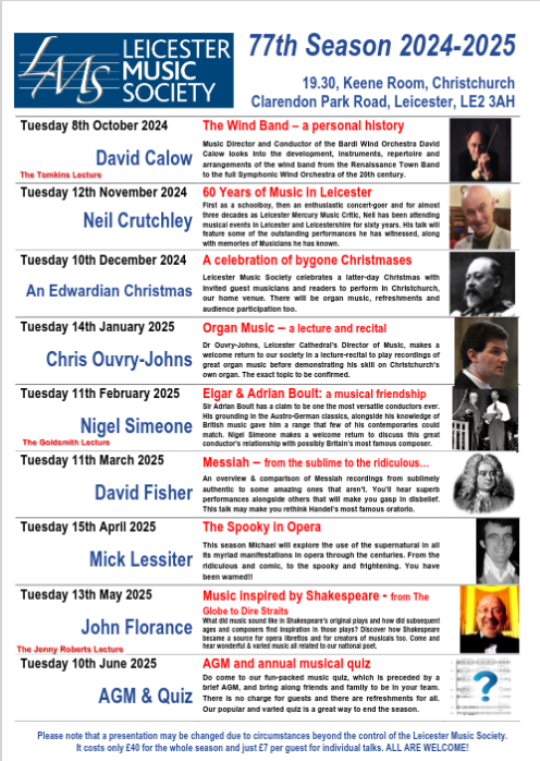 Click on the months on the left for details about each meeting. After each meeting has taken place its page will be supplemented by an appreciation, a list of musical extracts played, pictures, and other material.