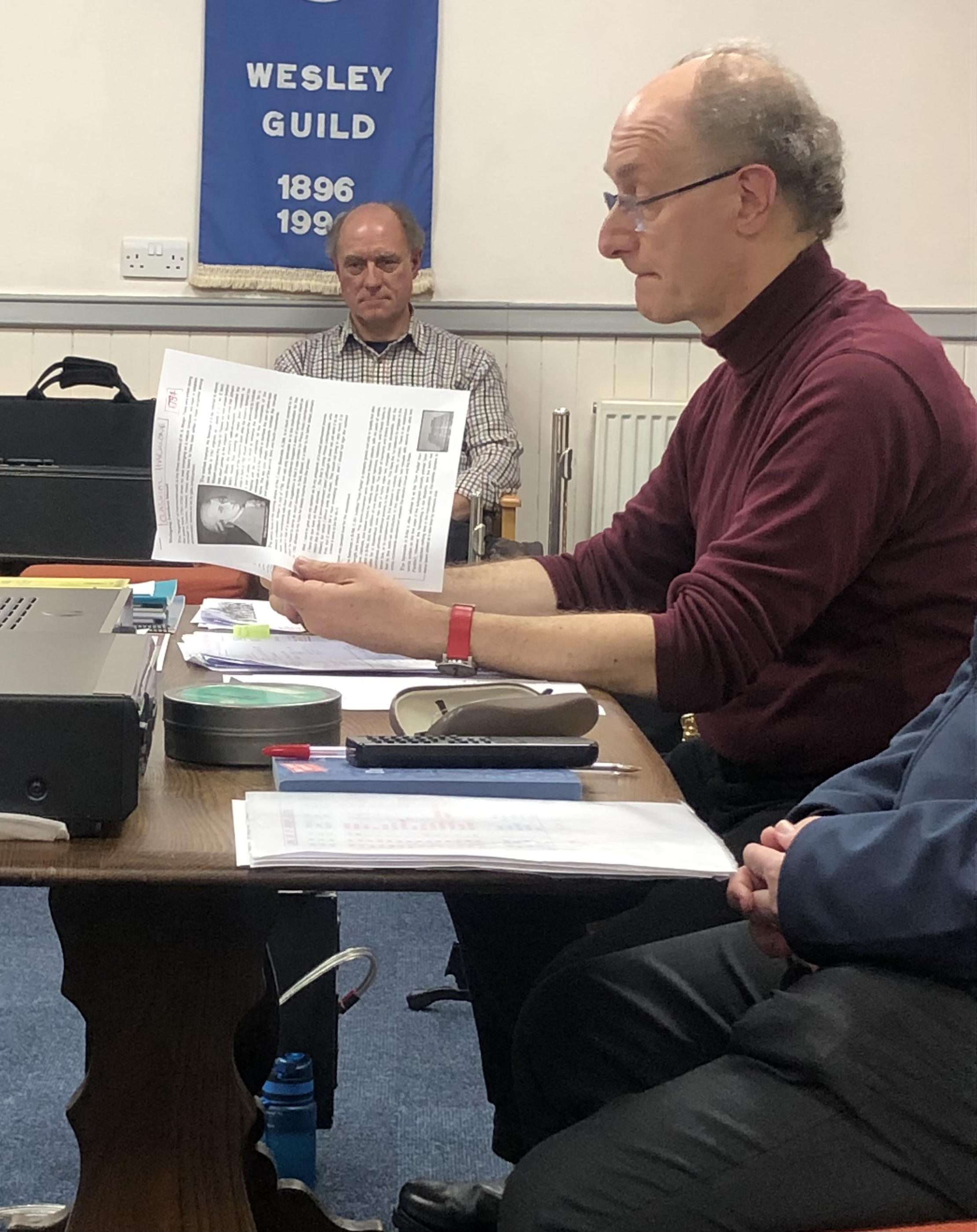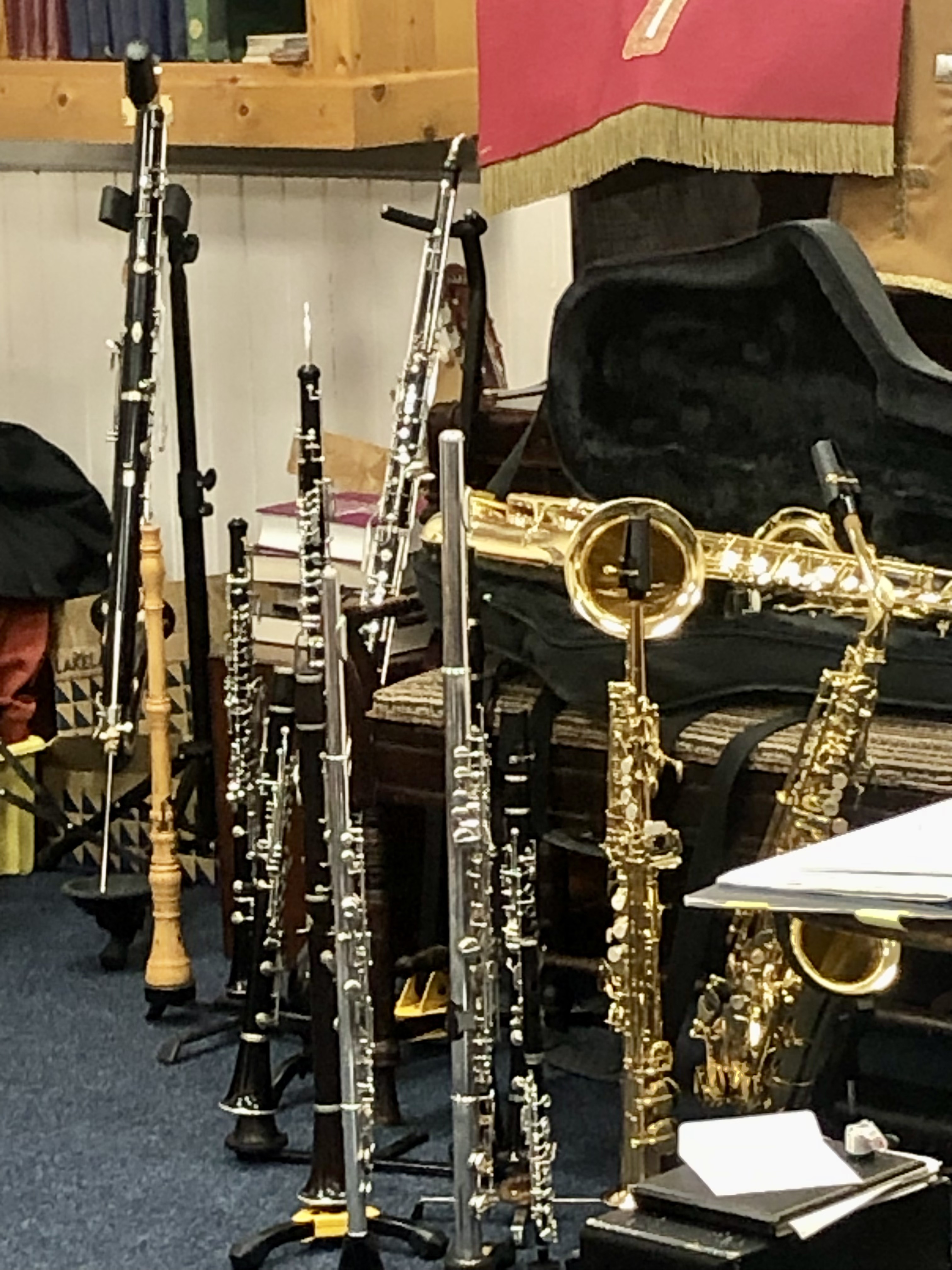 Every aspect of the historical development of wind groups over the centuries was covered, referring to composers and musical periods which, coupled with improvements in instrument technology, allowed for the development of wind groups in instrument range and the increasing size of the bands. It really helped that David and his twin Robert (who, fortunately for the Society, alternate in giving us presentations) and their willing spouses brought in about fifteen instruments, some very historic, to show us how they developed. Every instrument displayed was discussed, and that included an introduction to the saxophone, which has added so much to the sound of the modern wind band. David explained how wind bands/orchestras achieved particular prominence in American High Schools, which have for a long time led the educational world in the genre.